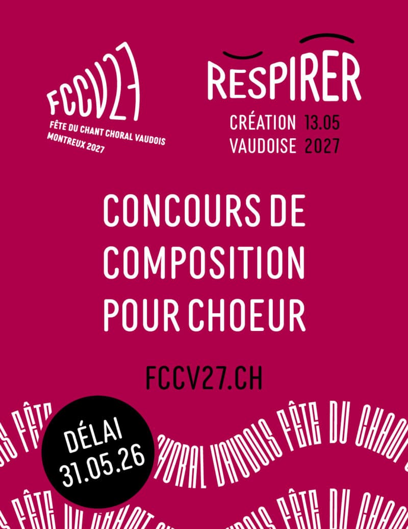 Dans le cadre du grand concert choral RESPIRER qui aura lieu le 13 mai 2027 et qui proposera des créations inédites, le comité d’organisation lance un appel à tous les compositeurs et toutes les compositrices vaudois·es !